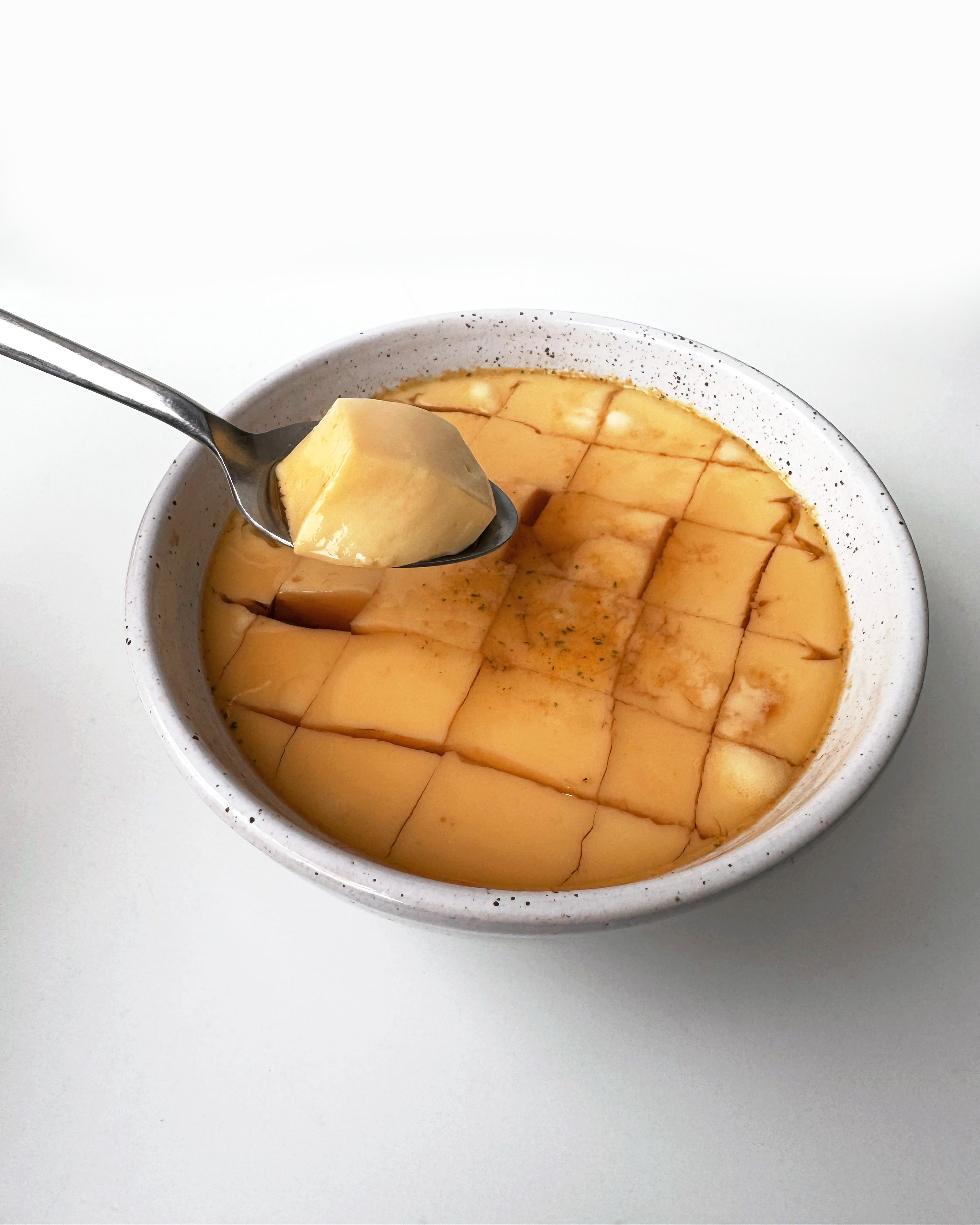 then turn off heat and continue to cook with residual heat for another 3-5 minutes. score the egg souffle with a knife into cubes, and add soy sauce and sesame oil to the top!