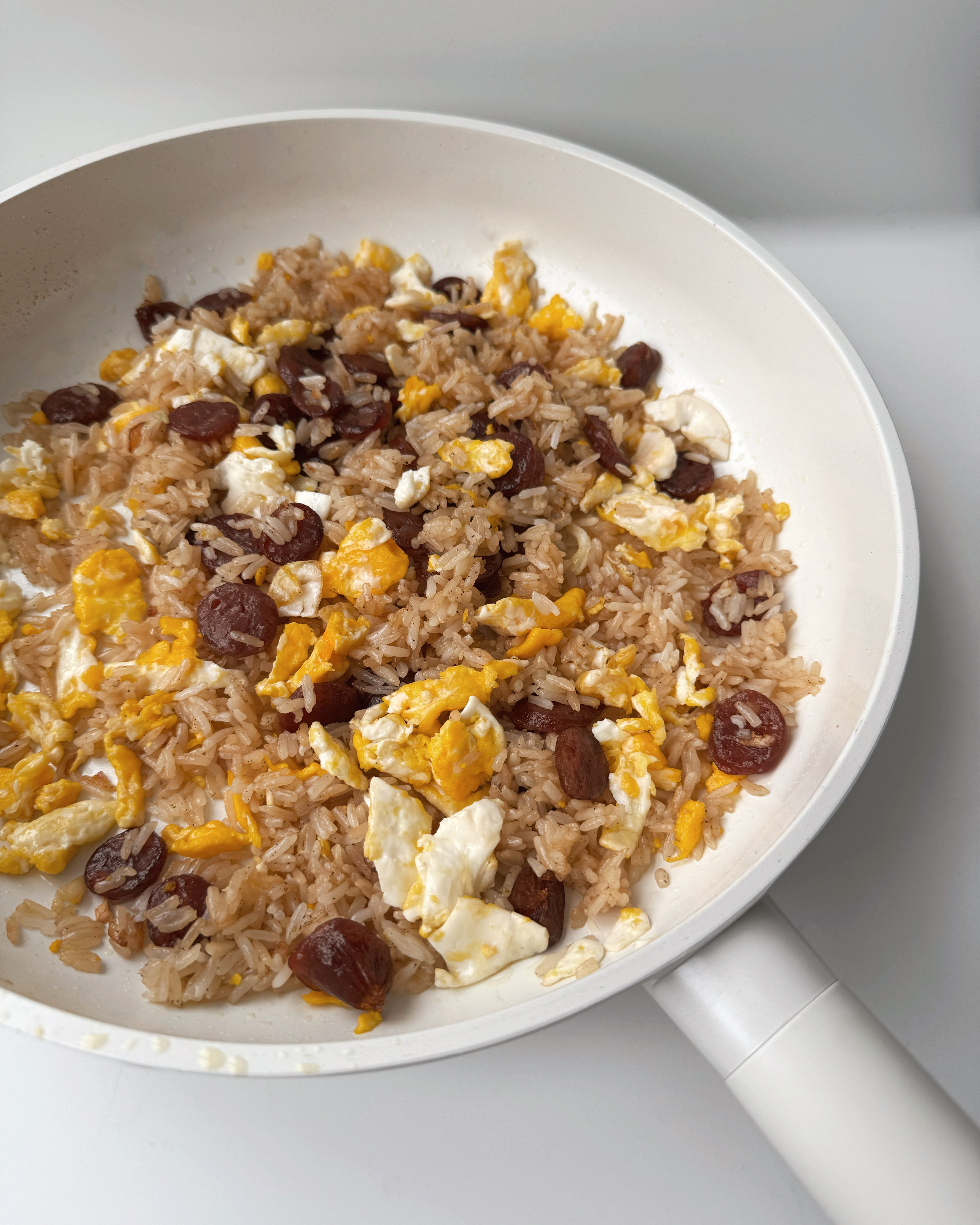 remove the eggs and pour a bit of oil or butter and start heating up the day old rice. add in the sausages and eggs back into the pan and add about a tablespoon of oyster sauce and toss.
